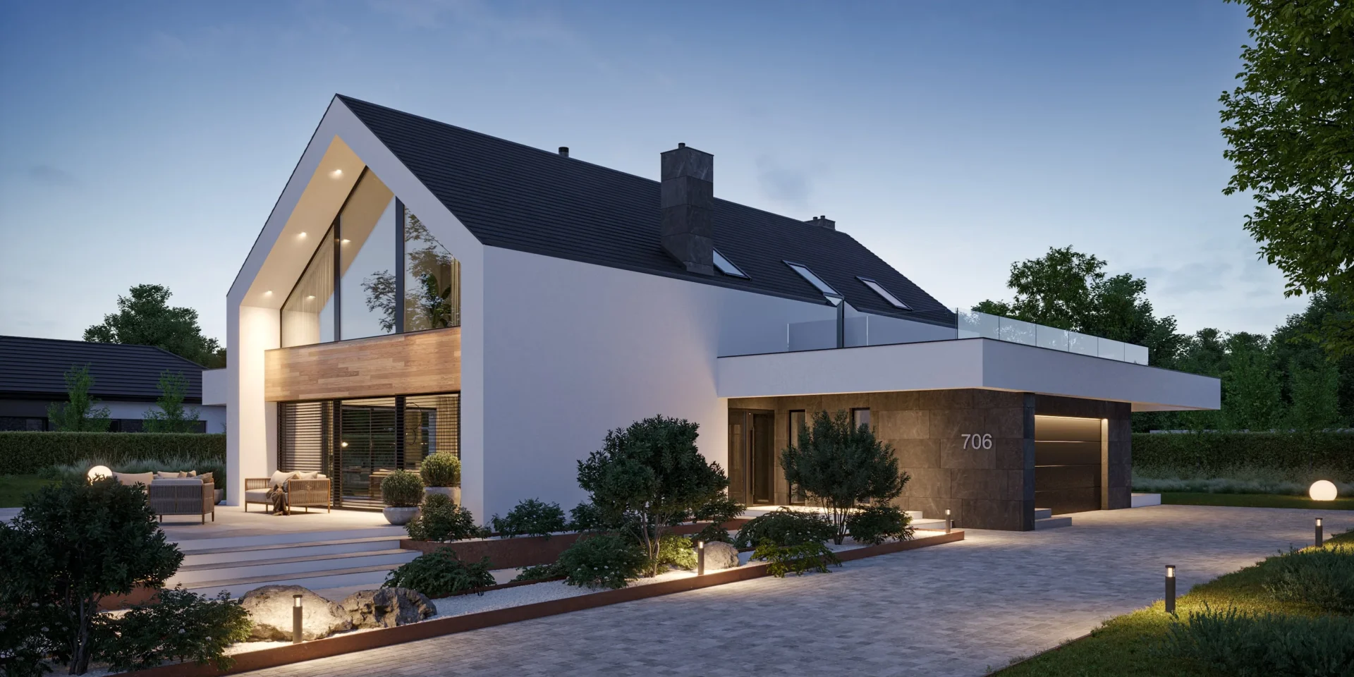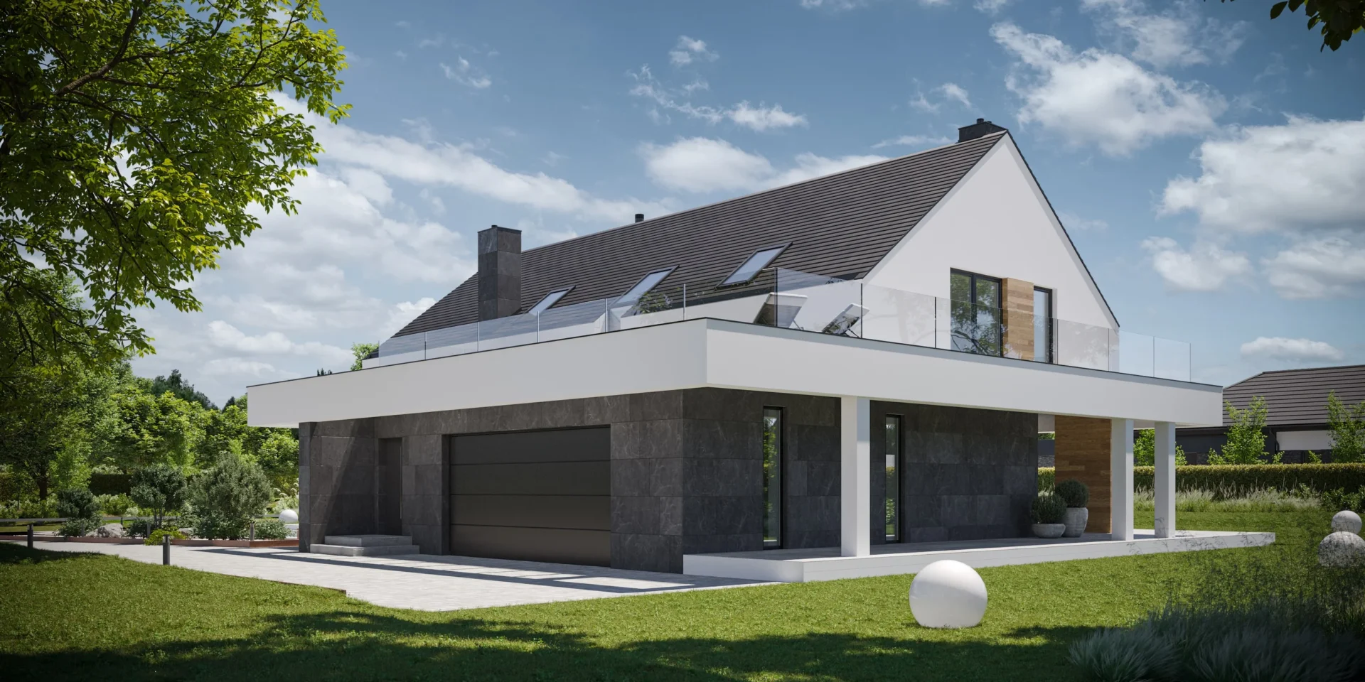 Projekt domu New House 706, utrzymanej w stylu nowoczesnej stodoły willi z poddaszem użytkowym zawiera również garaż na dwa pojazdy.