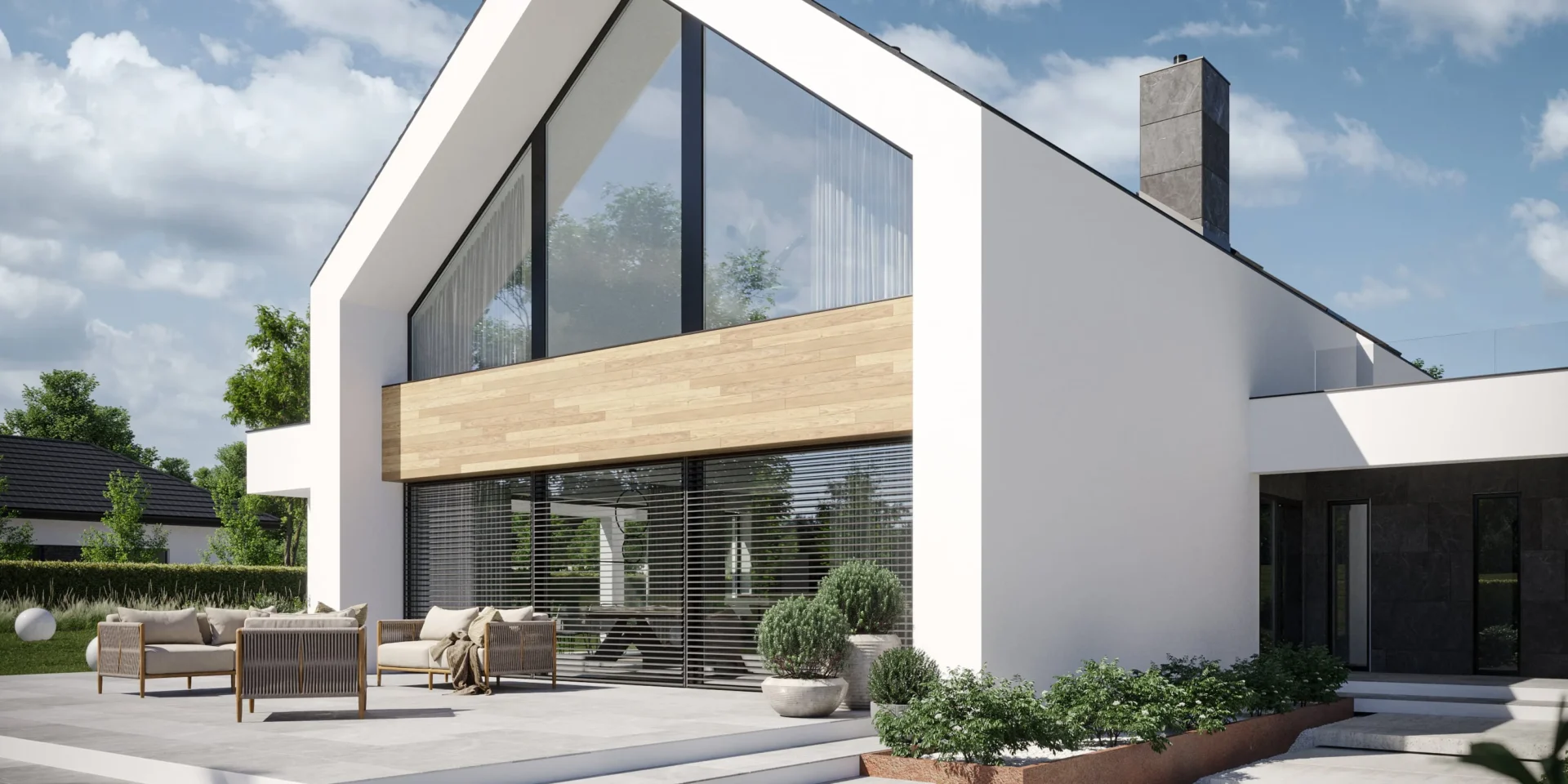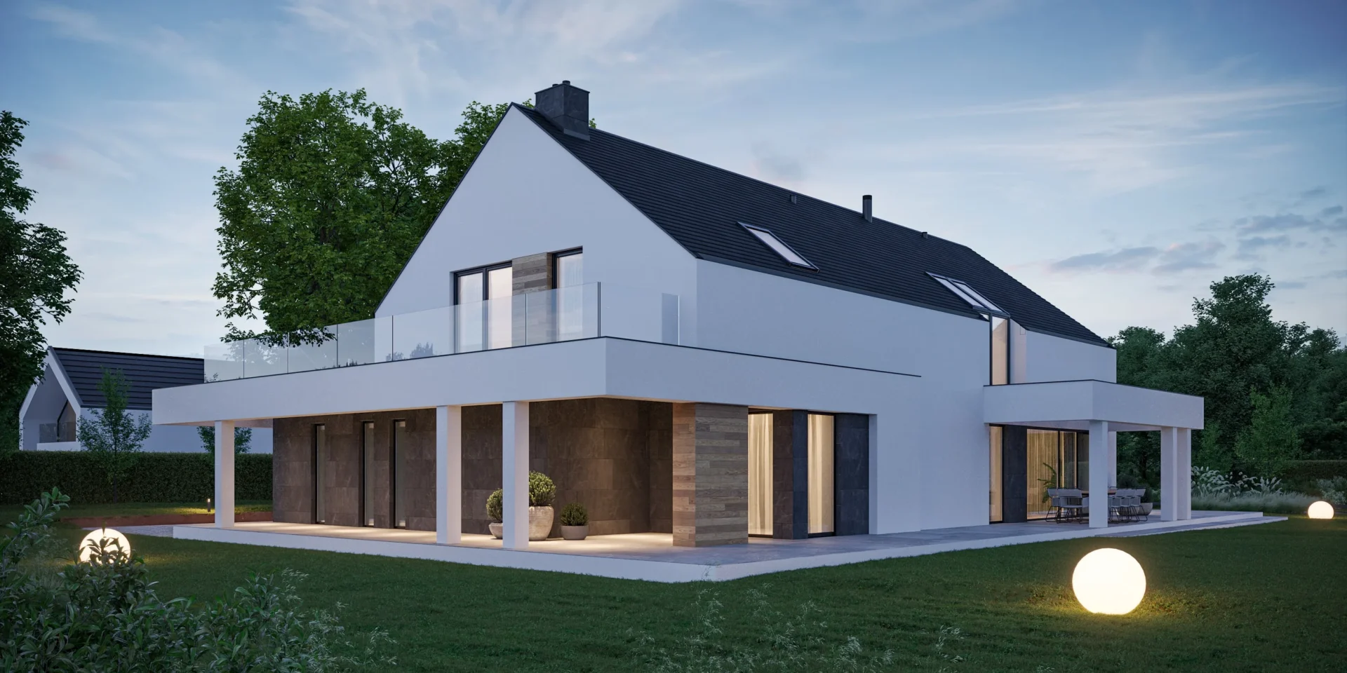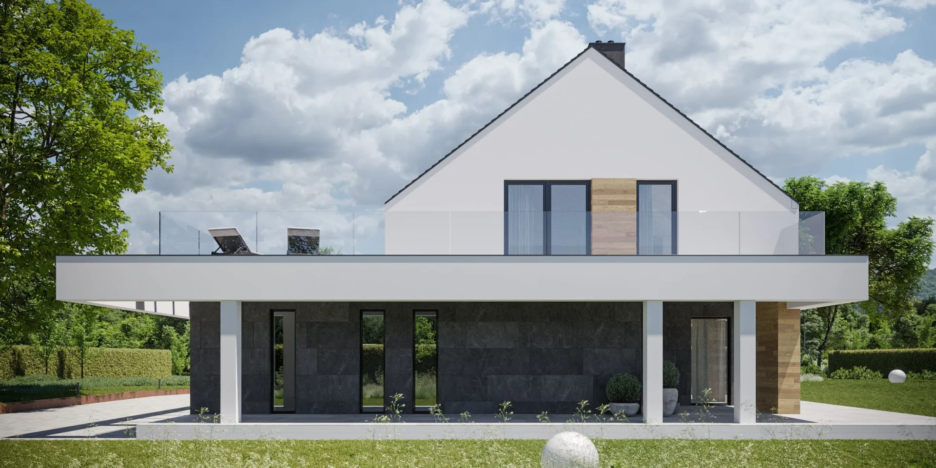 W kosztorysach domów MODERN HOUSE nie uwzględniamy elementów wykończeniowych na elewacji takich jak np. okładzin drewnianych, kamiennych czy płyt betonowych. Zakładamy ocieplenie ścian styropianem i wykończenie tynkiem, wiedząc, że każdy może chcieć zrealizować swój dom według odmiennych upodobań.