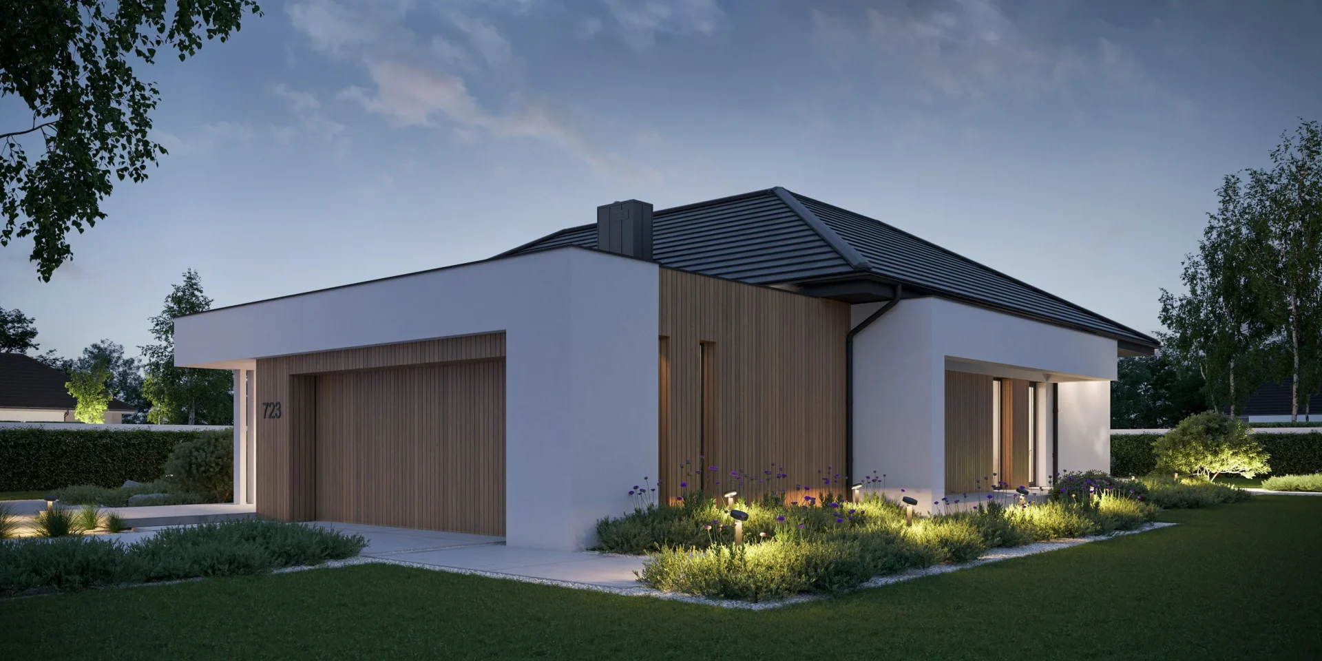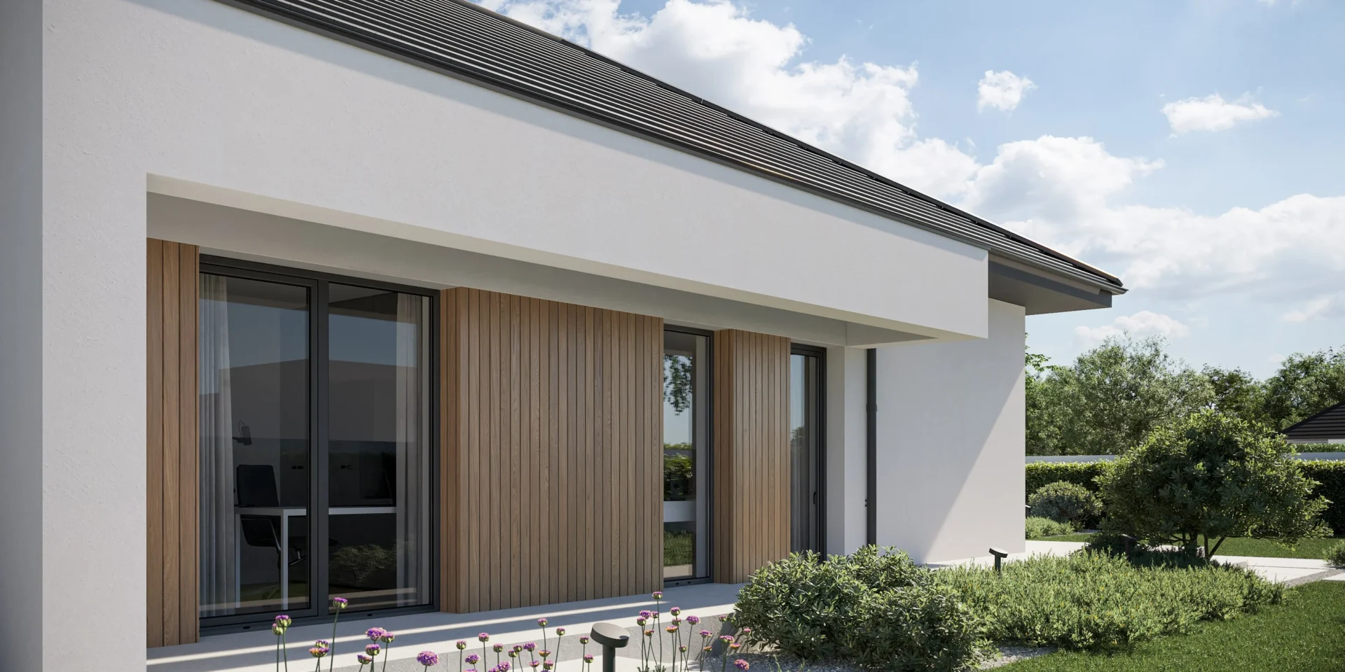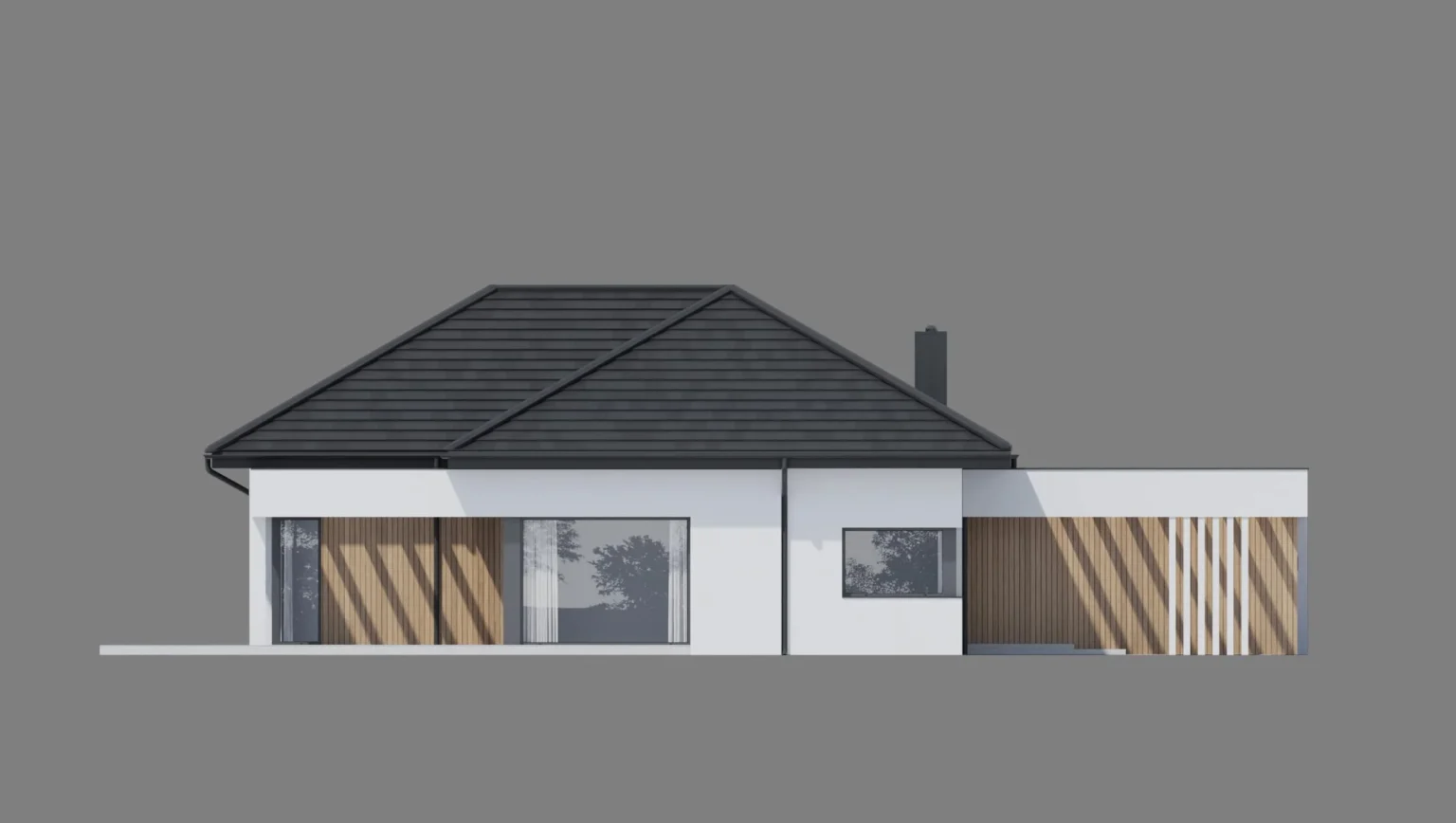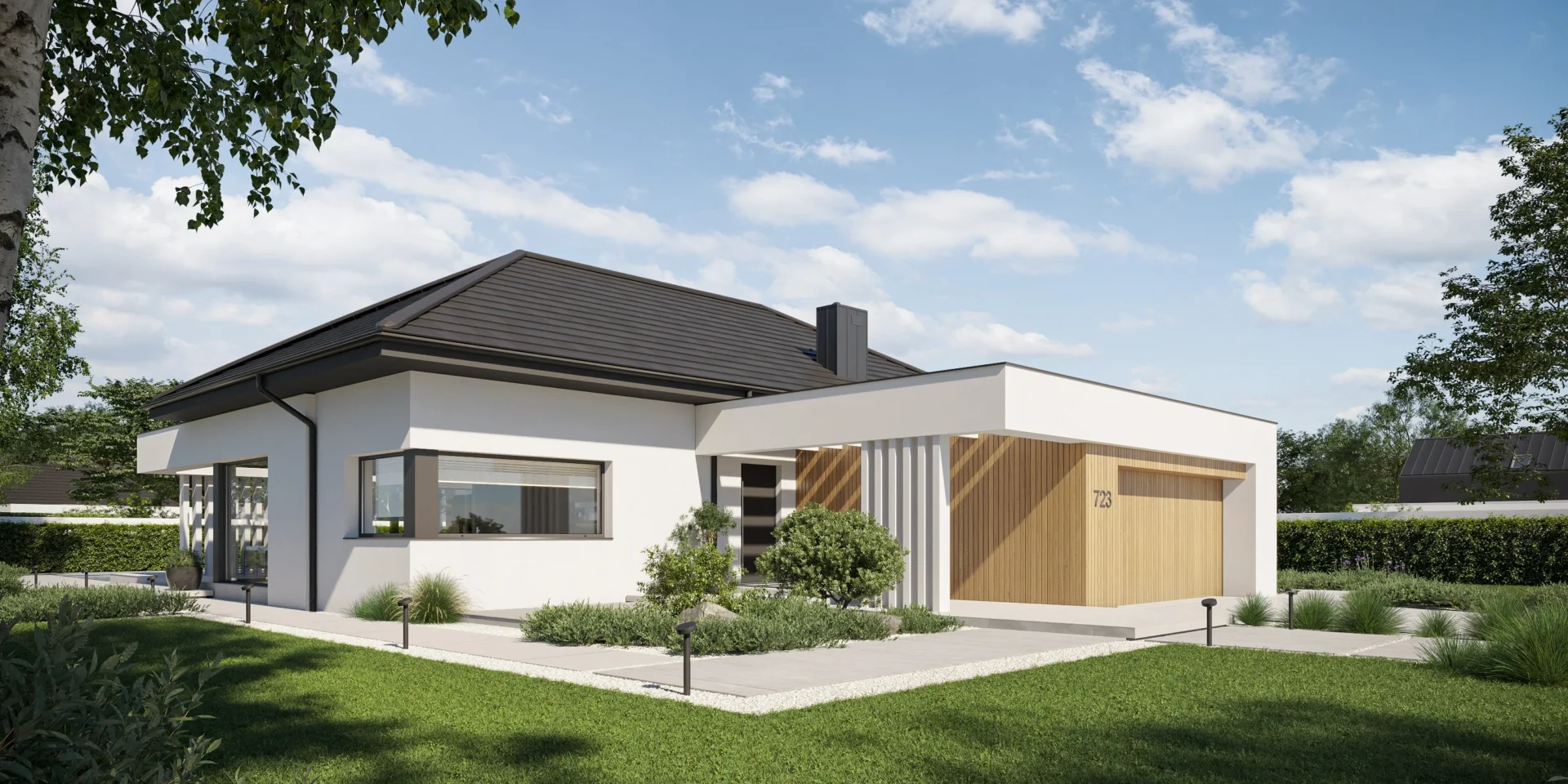 Elewacja budynku urzeka swą prostotą. Biały tynk silikonowy został połączony z elementami jasnej okładziny drewnianej o ciepłym odcieniu, mogą to być również lamele kompozytowe. Do tego grafitowa stolarka okienna i drzwiowa oraz grafitowa dachówka płaska nadają parterowemu budynkowi nowoczesnego charakteru. Duże panoramiczne przeszklenia zapewniają optymalną ilość naturalnego światła we wnętrzu a przy tym sprawiają, że bryła budynku nabiera lekkości.