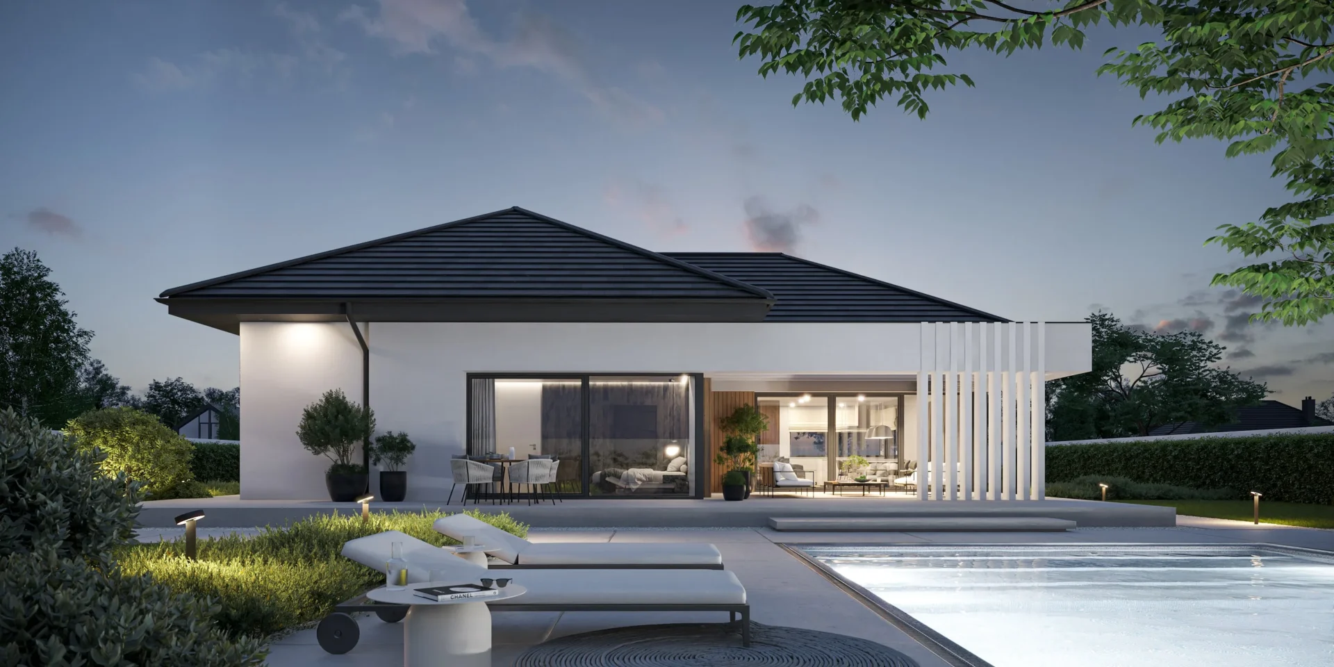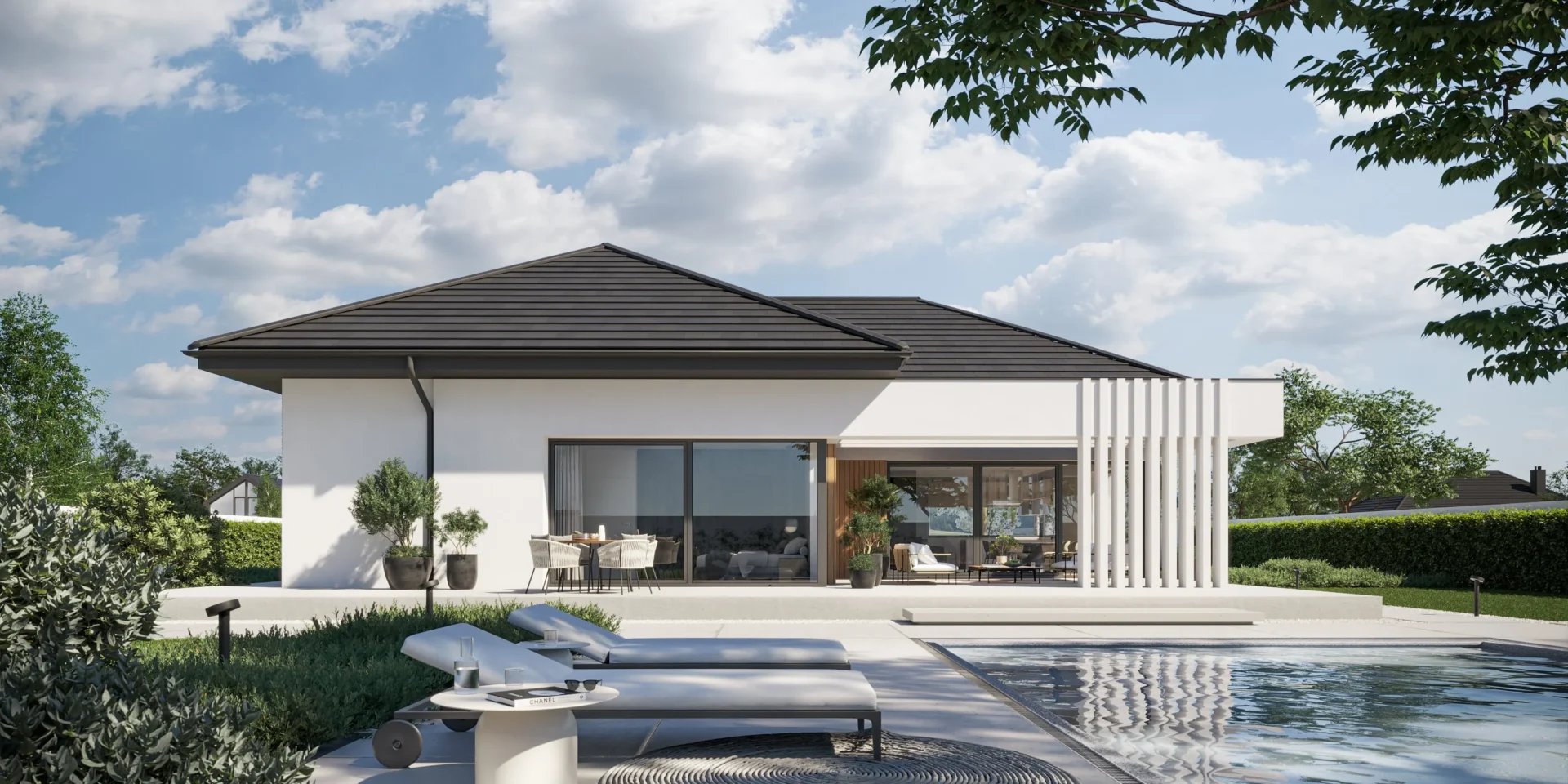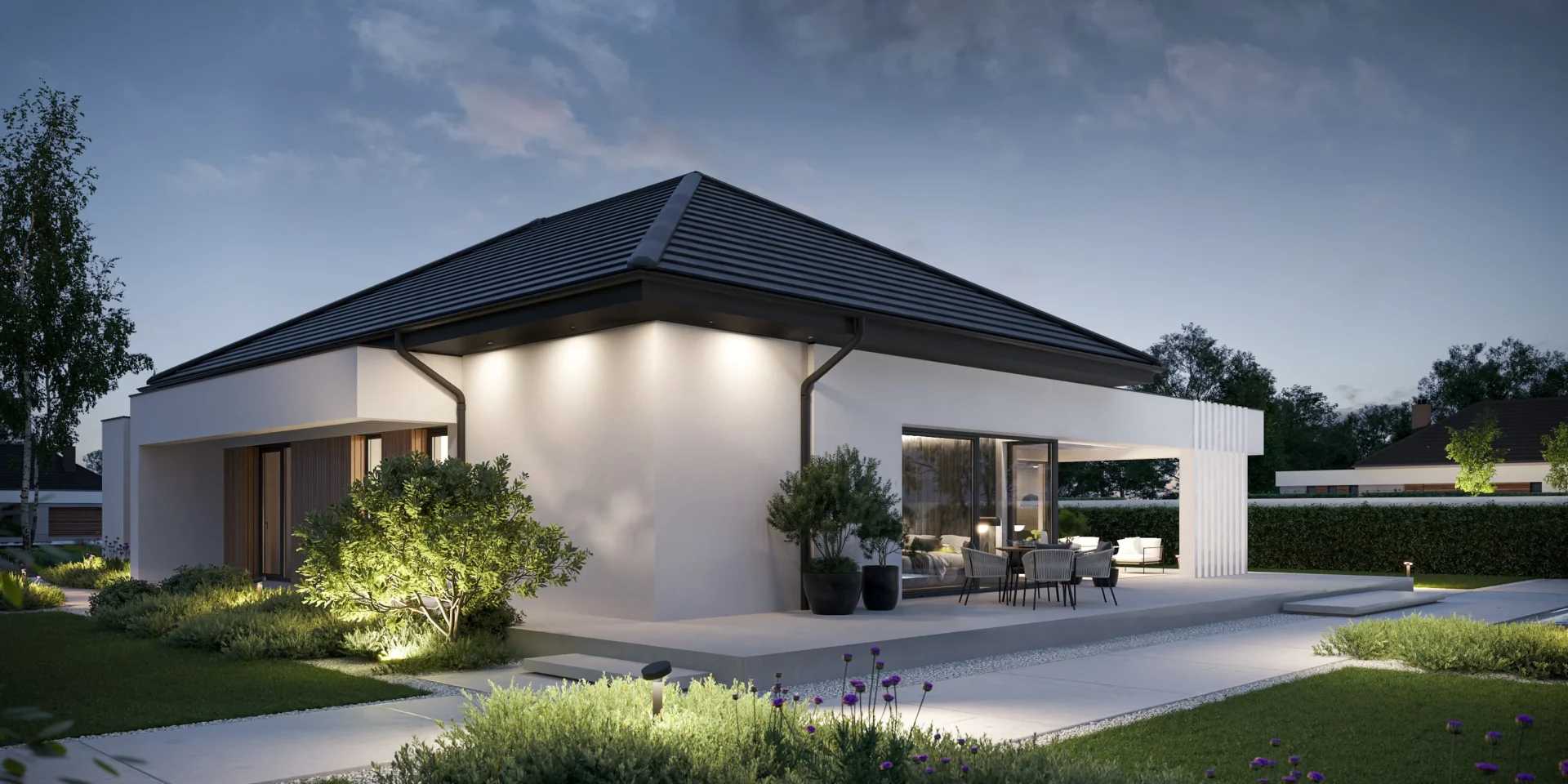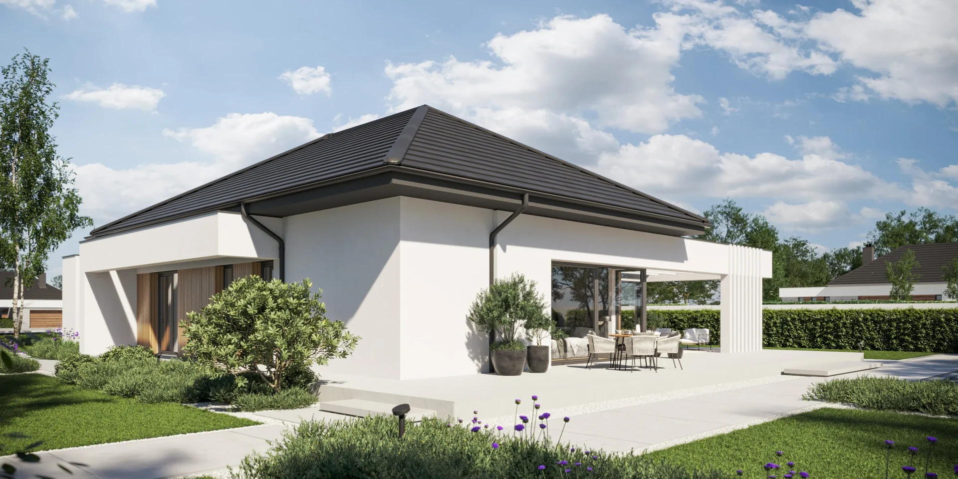 Elewacja budynku urzeka swą prostotą. Biały tynk silikonowy został połączony z elementami jasnej okładziny drewnianej o ciepłym odcieniu, mogą to być również lamele kompozytowe. Do tego grafitowa stolarka okienna i drzwiowa oraz grafitowa dachówka płaska nadają parterowemu budynkowi nowoczesnego charakteru. Duże panoramiczne przeszklenia zapewniają optymalną ilość naturalnego światła we wnętrzu a przy tym sprawiają, że bryła budynku nabiera lekkości.