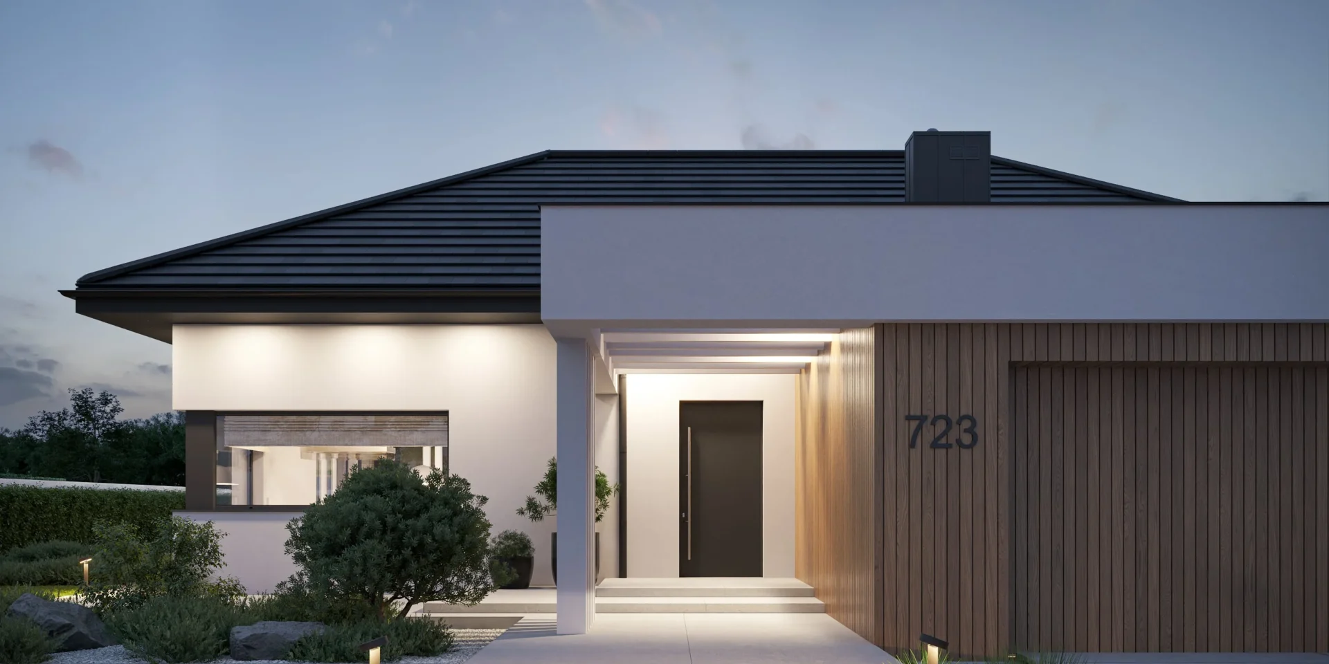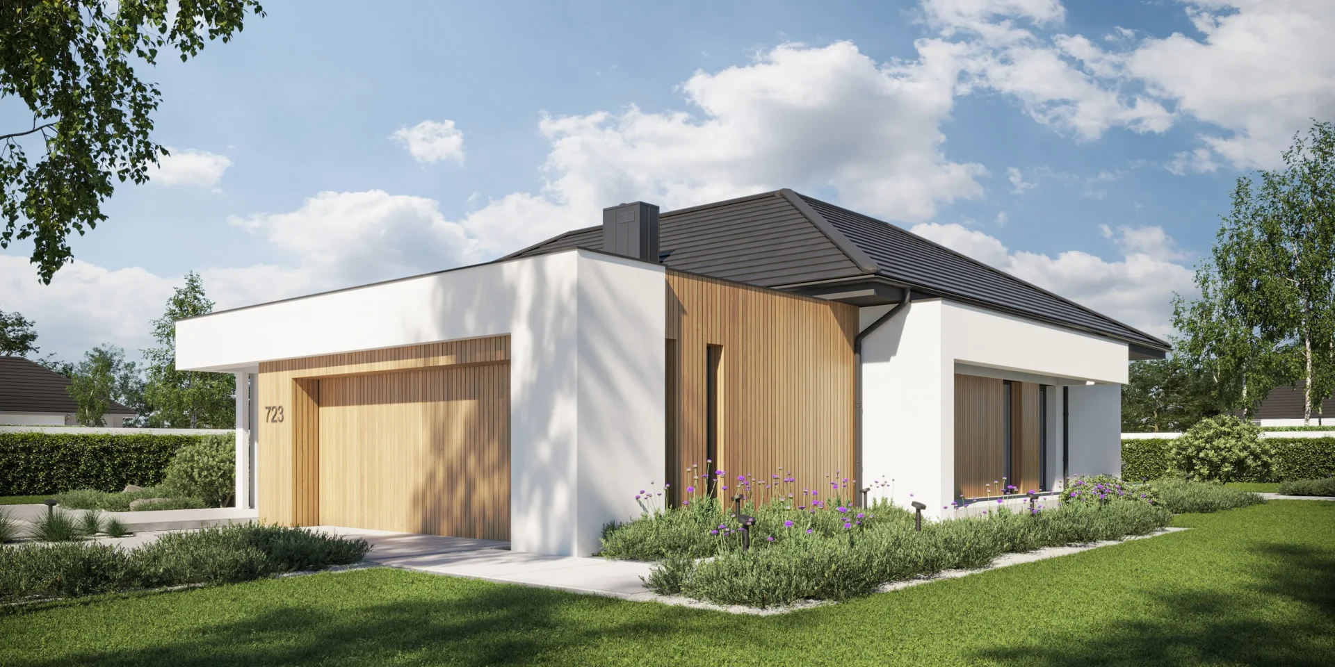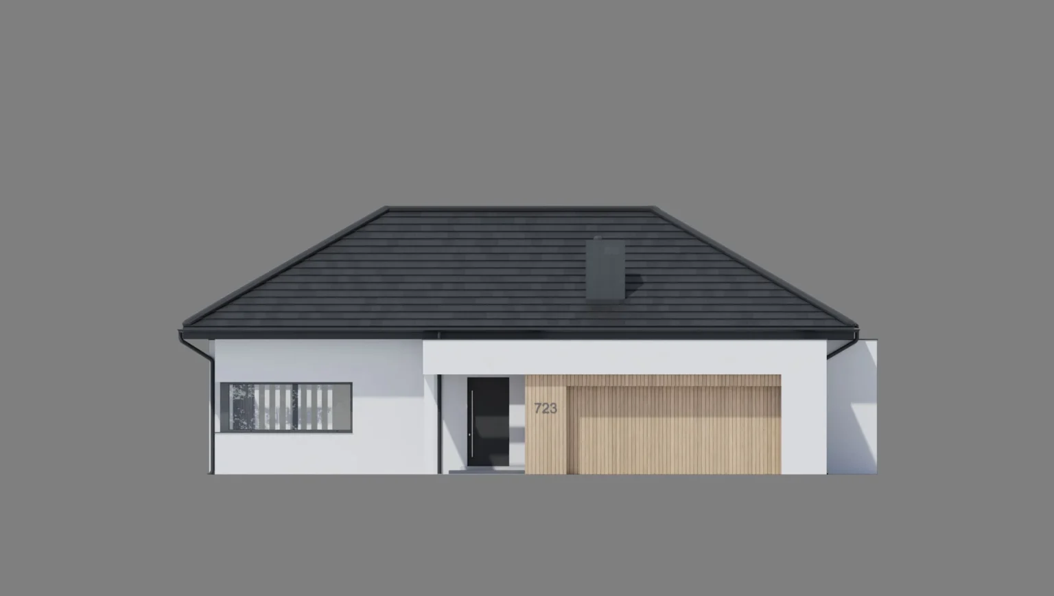 NewHouse 723 to elegancki parterowy dom przykryty dachem wielospadowym z szerokim dwustanowiskowym garażem. Część mieszkalna zaprojektowana jest na planie litery L, garaż natomiast został wysunięty przed lico budynku i przykryty dachem płaskim. Wejście do budynku ulokowane jest pod wysuniętym poza lico budynku belkowaniem, które nadaje bryle ciekawego wyglądu i pełni funkcję ozdobnej przesłony. Pionowe ażurowe belki podpierające pergolę dają wiele możliwości aranżacji wejścia, np. można je obsadzić pnącymi roślinami. Takie rozwiązanie będzie świetnie korespondowało z ogrodem.