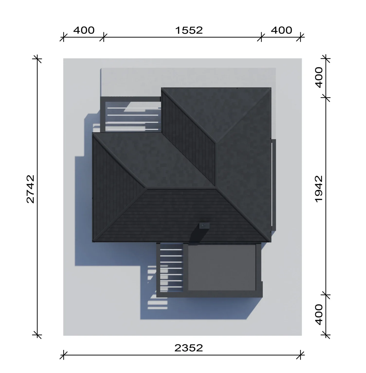 • Dach Wielospadowy kryty dachówką ceramiczną. Nad garażem stropodach pełny kryty membraną EPDM
