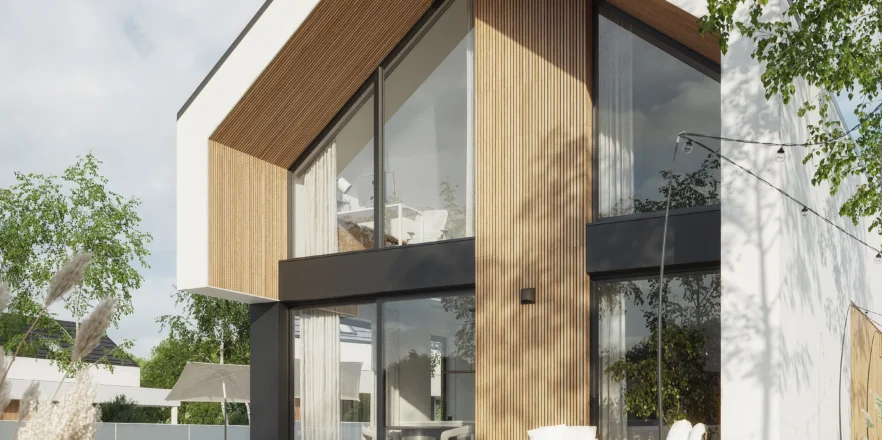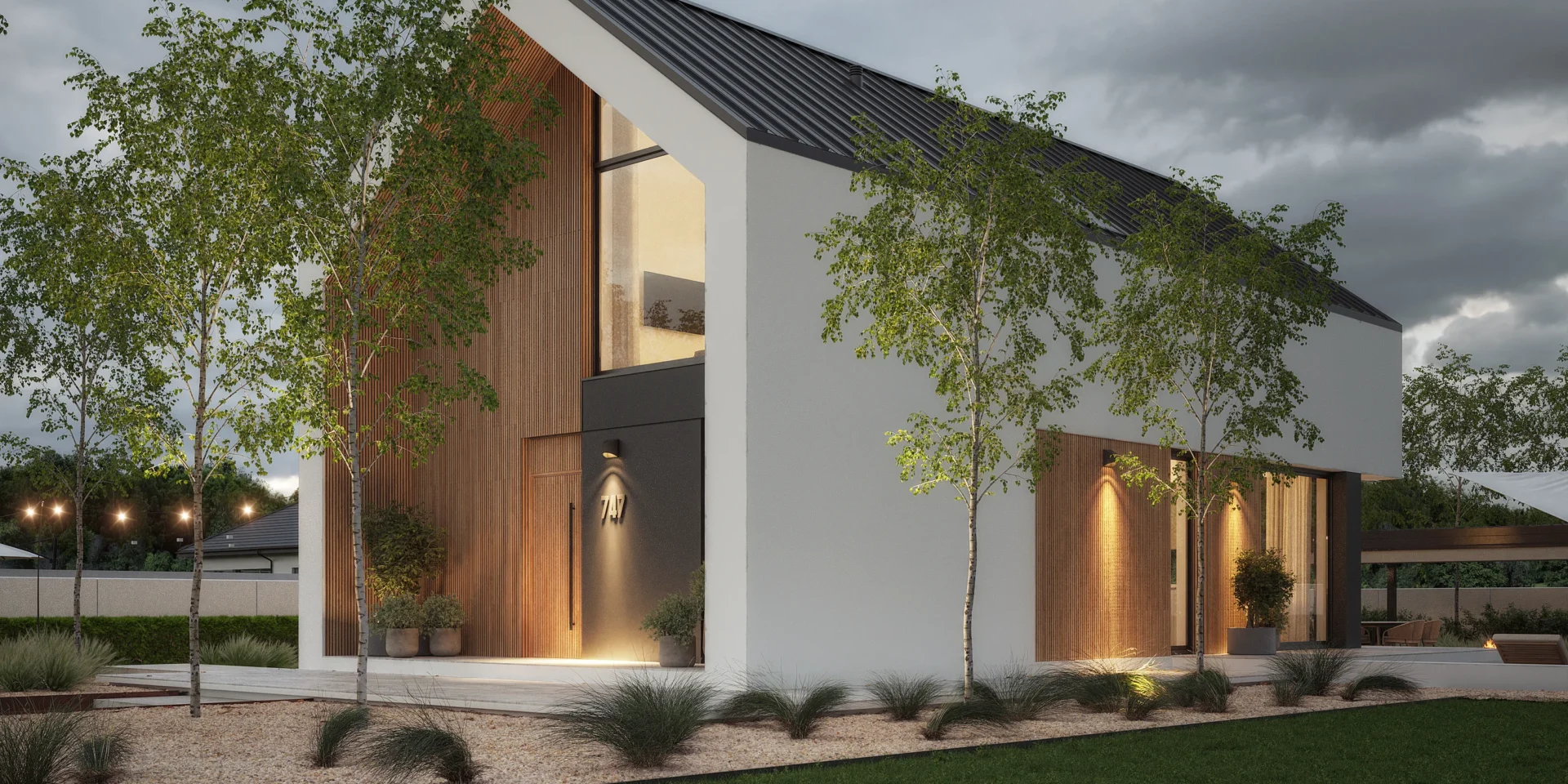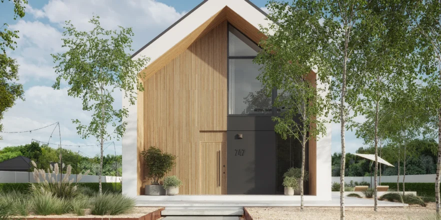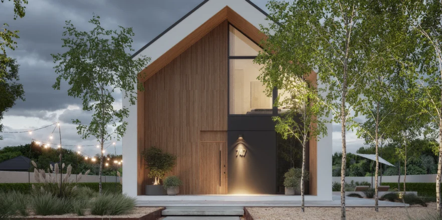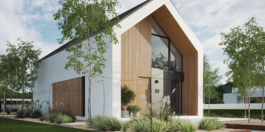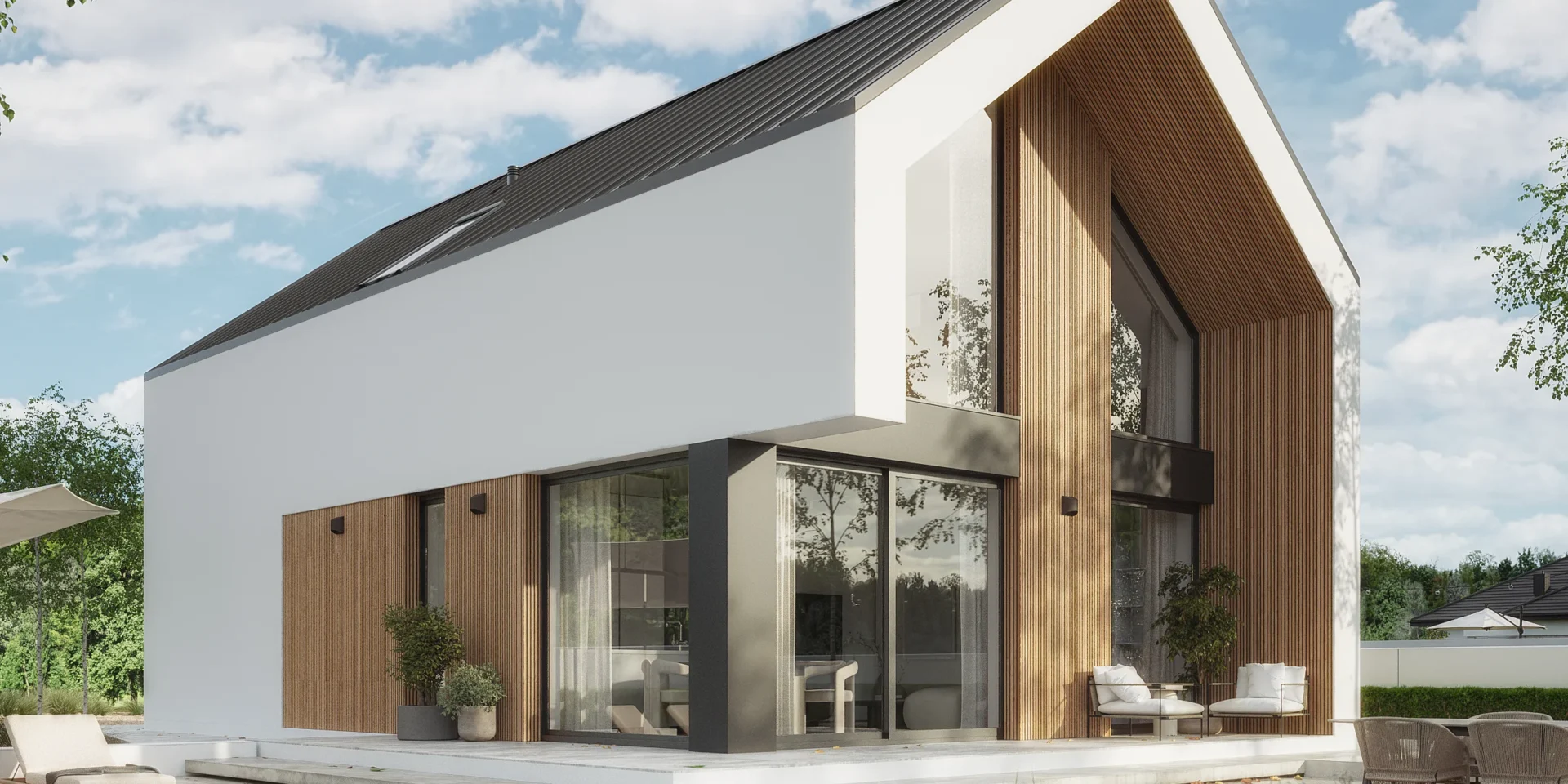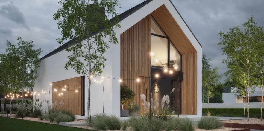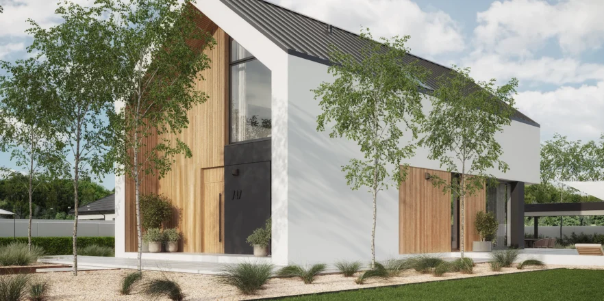 Wyciągnięte ściany szczytowe oraz wysunięte elementy konstrukcyjne poza obrys budynku tworzą efekt dynamicznej, współczesnej formy. Elewacja w białym i grafitowym tynku została przełamana wyraźnymi akcentami drewnianymi, które ocieplają minimalistyczną bryłę.