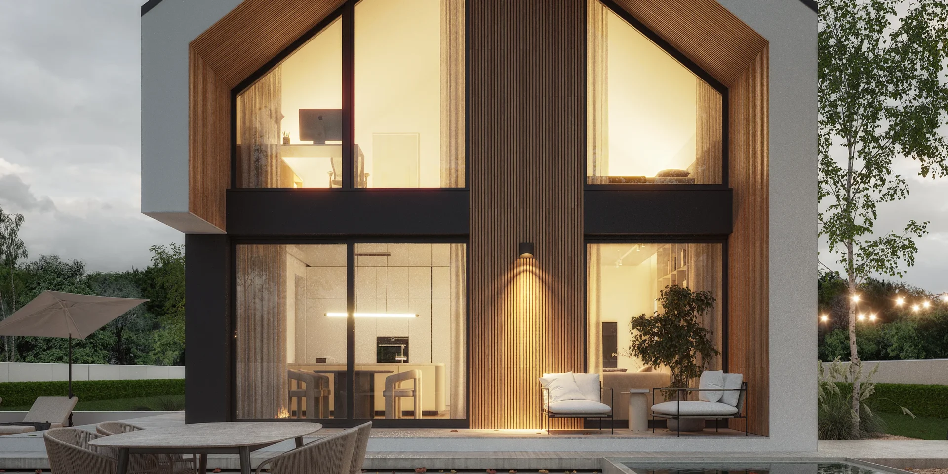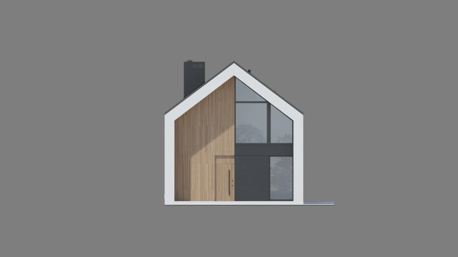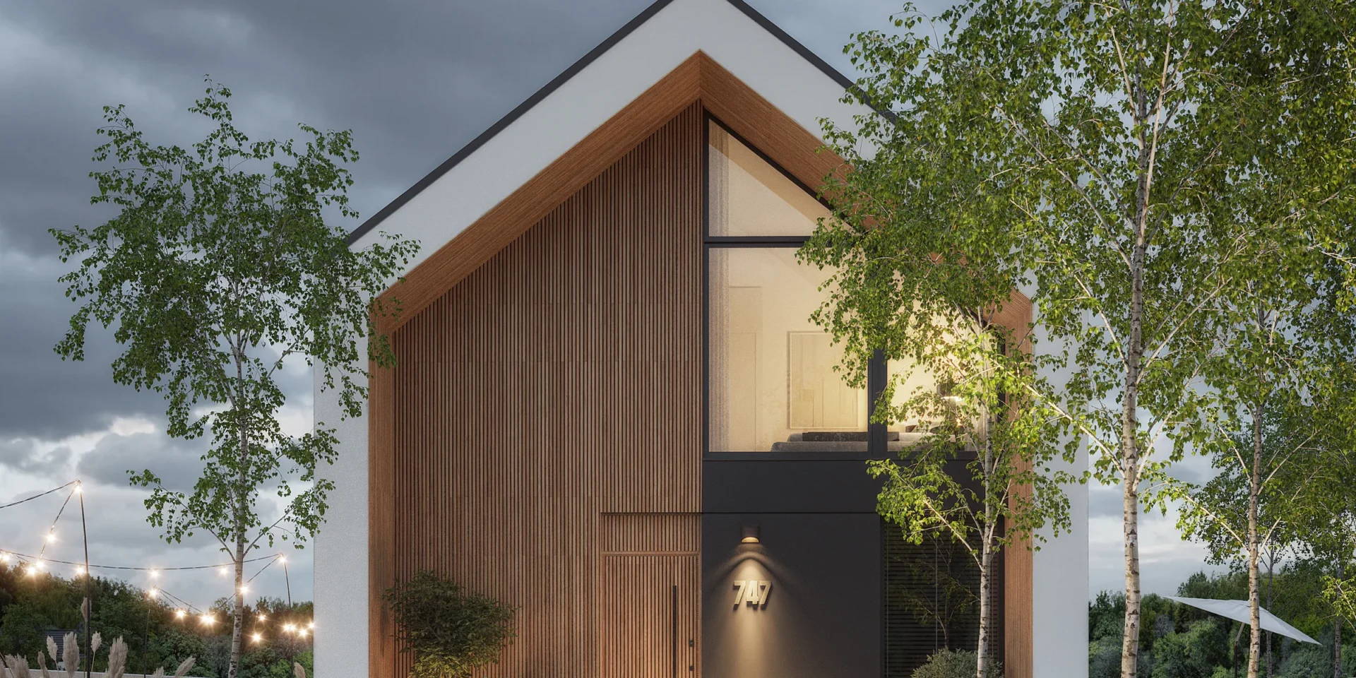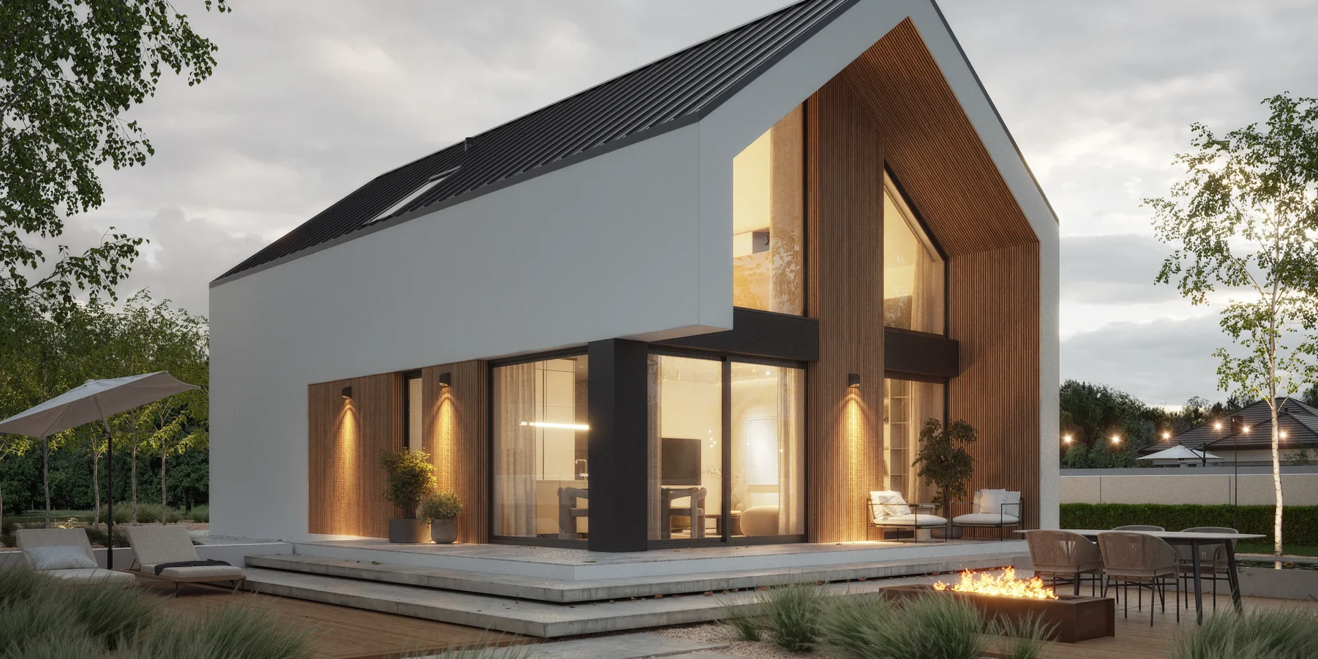 Wyciągnięte ściany szczytowe oraz wysunięte elementy konstrukcyjne poza obrys budynku tworzą efekt dynamicznej, współczesnej formy. Elewacja w białym i grafitowym tynku została przełamana wyraźnymi akcentami drewnianymi, które ocieplają minimalistyczną bryłę.