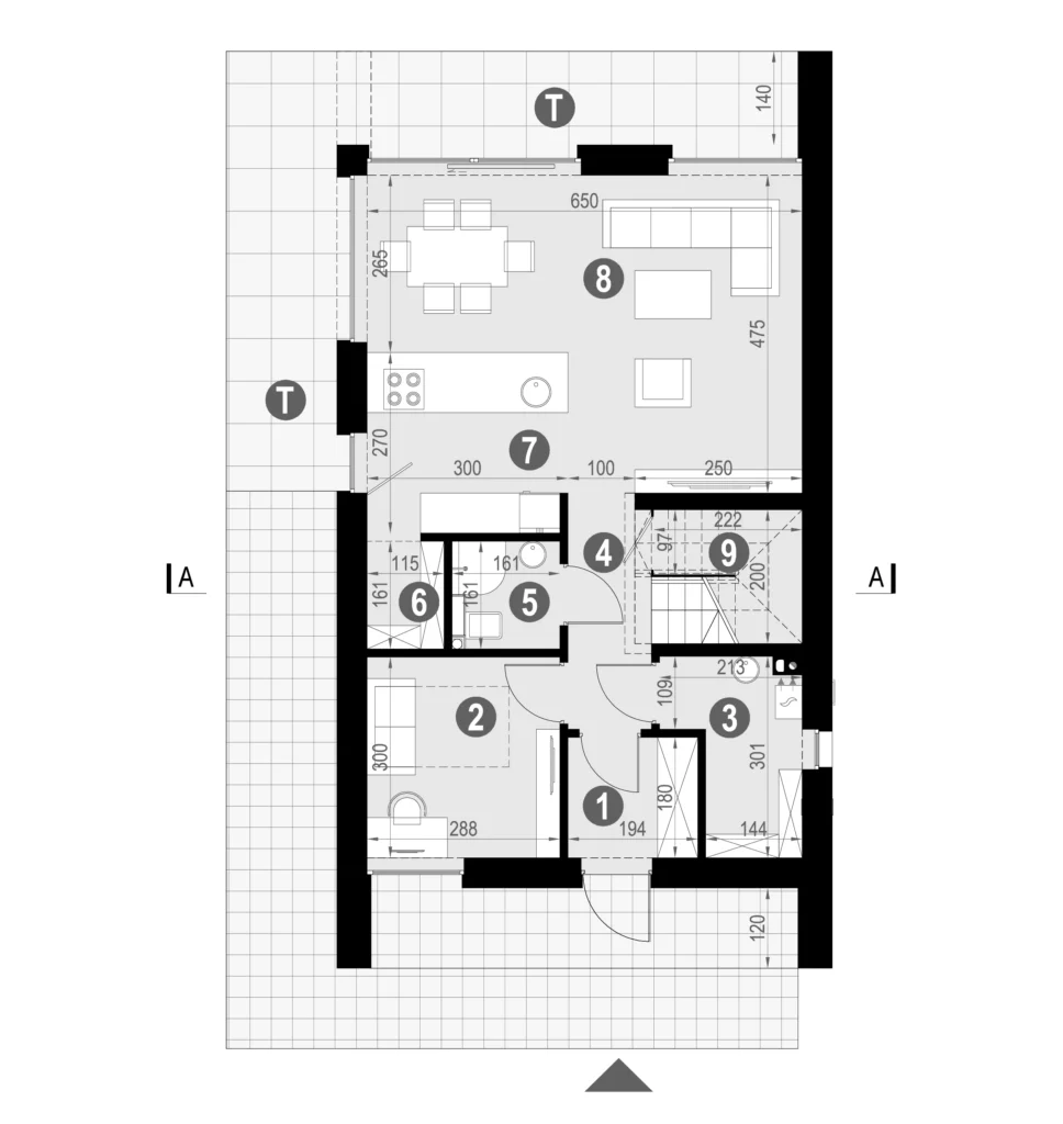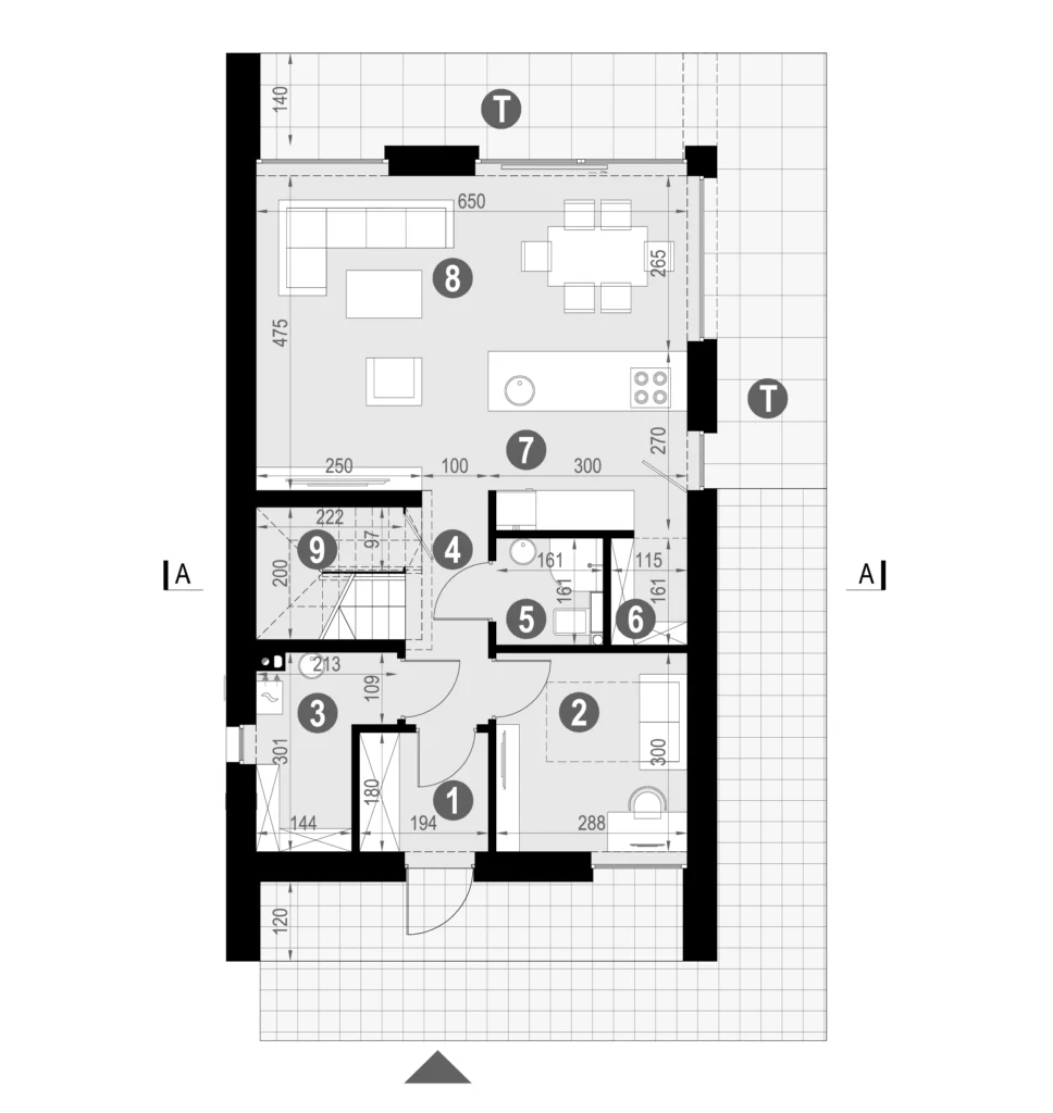 NewHouse 747 został zaprojektowany z myślą o działkach o ograniczonej szerokości. To projekt domu na wąską działkę, który doskonale wpisuje się w parcelę do 15,5 m szerokości, zachowując komfortowy układ wnętrz i odpowiednie doświetlenie.
