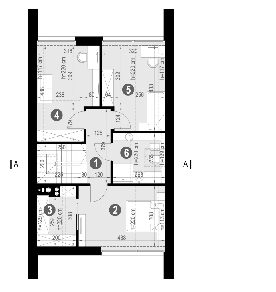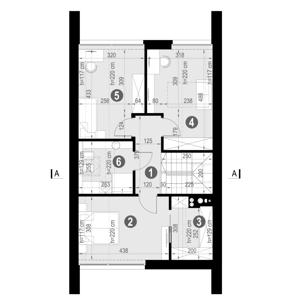 Poddasze użytkowe zostało zaprojektowane z dbałością o ergonomię i wygodę. Ścianka kolankowa o wysokości 129 cm pozwala na komfortowe ustawienie mebli oraz realne wykorzystanie przestrzeni.