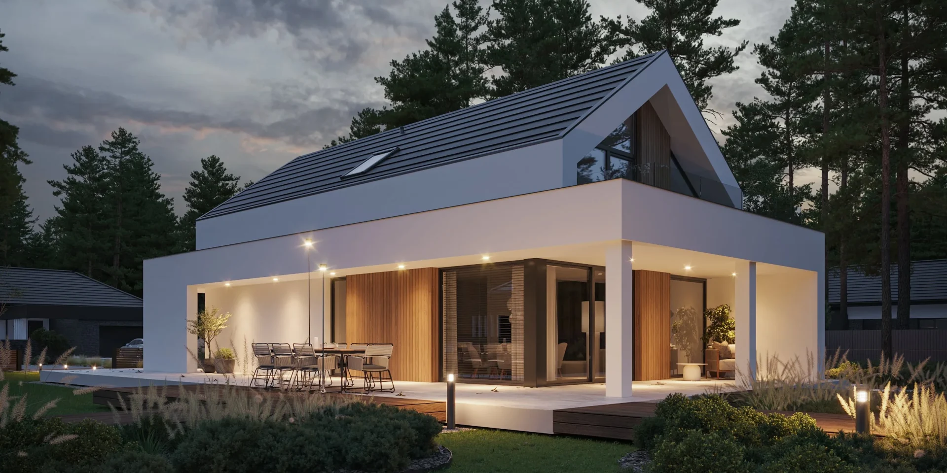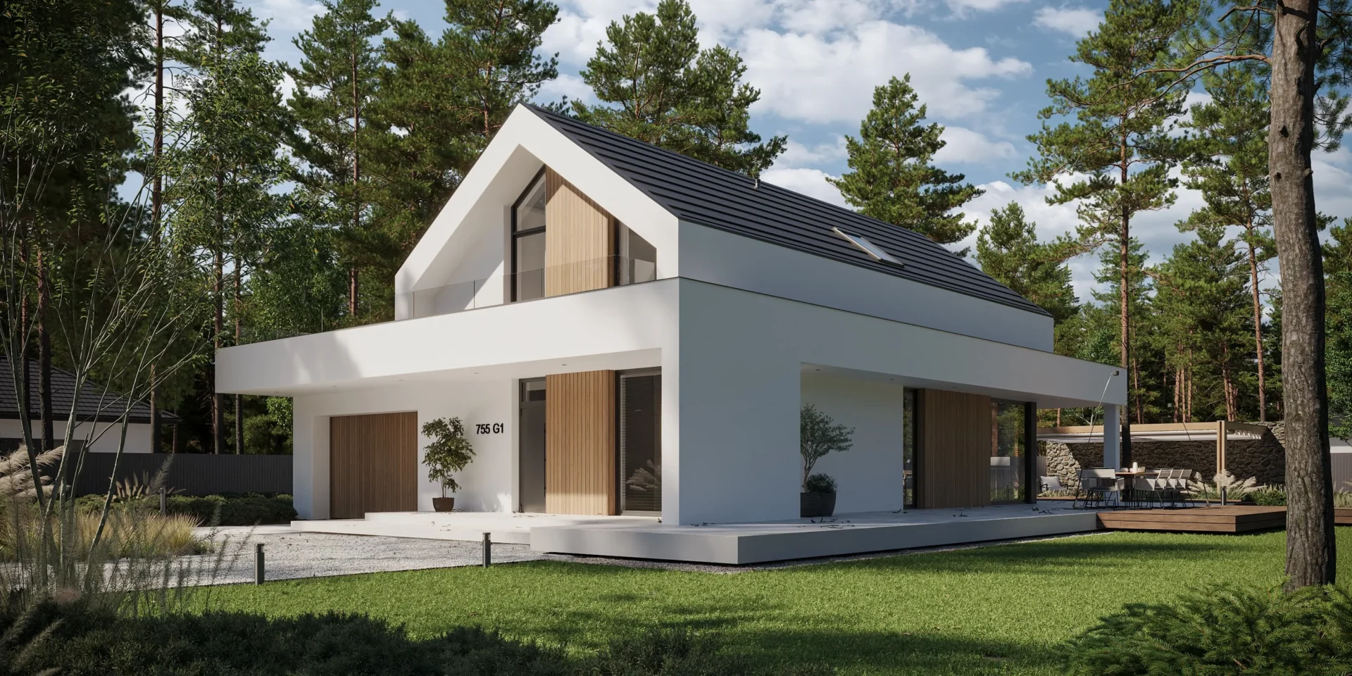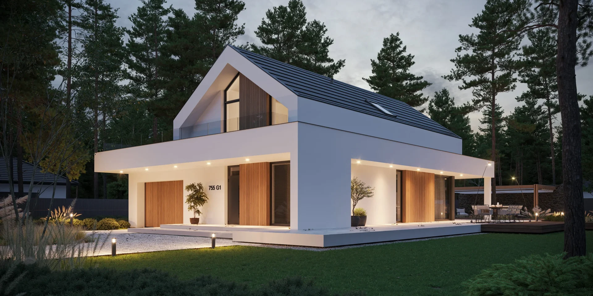 Jeśli szukasz projektu domu zachwycającego swoją funkcjonalnością, prostotą i elegancją to idealnie trafiłeś. Prosta bryła na planie prostokątów, dwuspadowy, bezokapowy dach i biała elewacja z elementami jasnego drewna przyciągają uwagę i zapraszają do przyjrzenia się temu projektowi dokładniej.