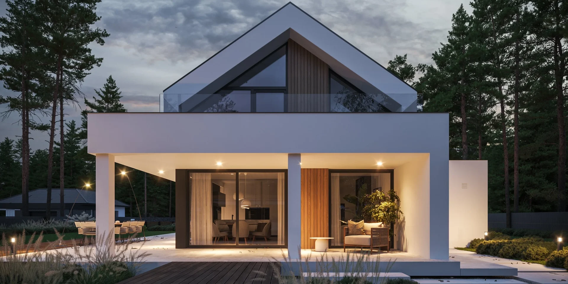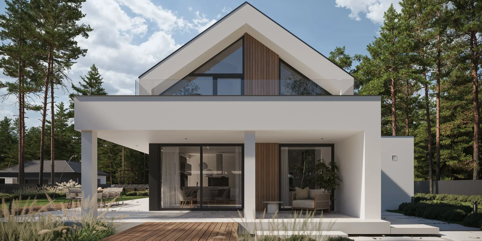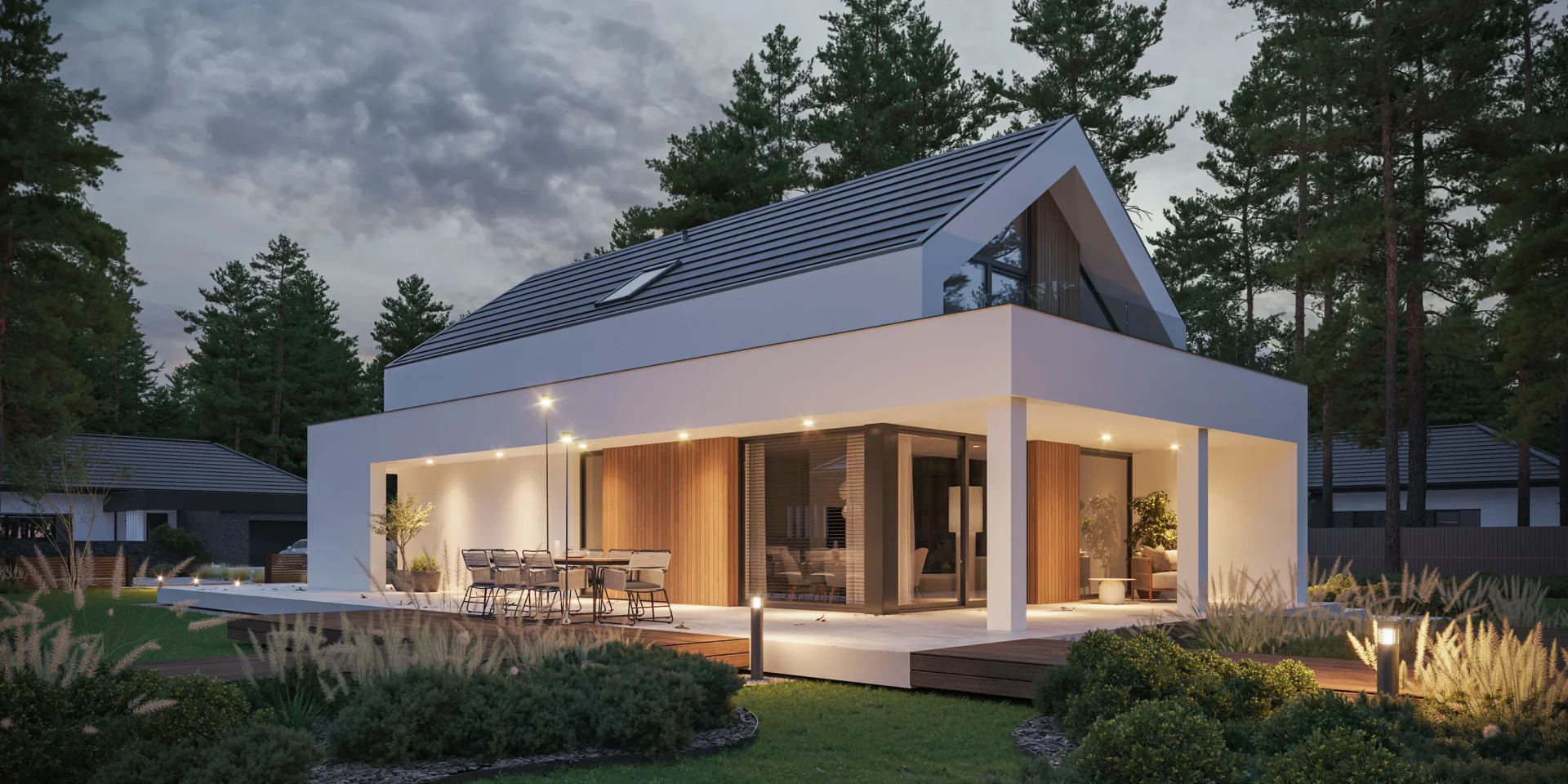 Jeśli szukasz projektu domu zachwycającego swoją funkcjonalnością, prostotą i elegancją to idealnie trafiłeś. Prosta bryła na planie prostokątów, dwuspadowy, bezokapowy dach i biała elewacja z elementami jasnego drewna przyciągają uwagę i zapraszają do przyjrzenia się temu projektowi dokładniej.