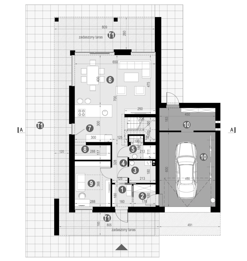 Nad garażem znajduje się taras, który jest idealnym rozwiązaniem dla tych inwestorów, których działki leżą w terenach, gdzie nie można mieć płaskich dachów.