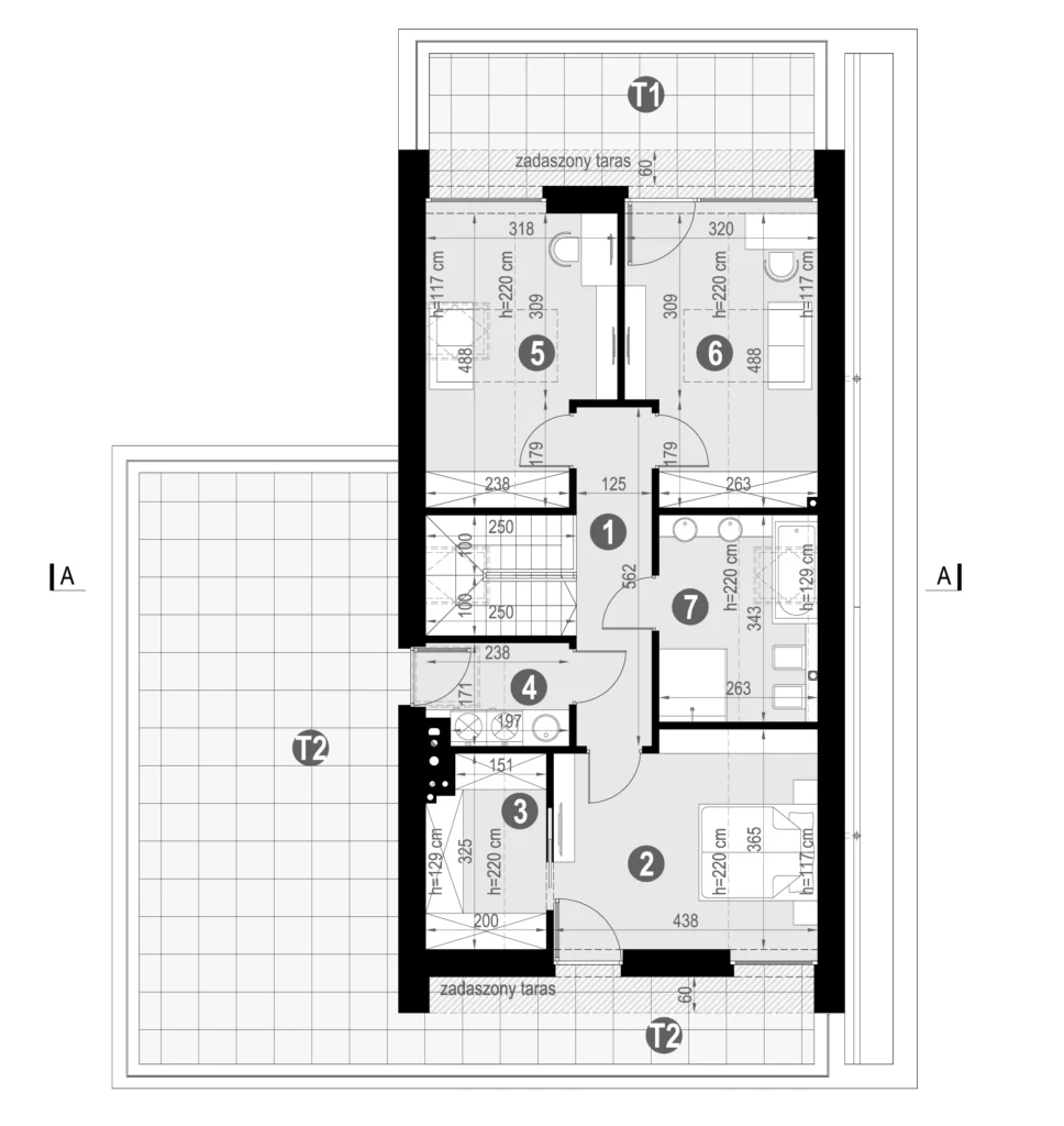 Poddasze to strefa prywatna gdzie znajdują się 3 sypialnie, każda z bezpośrednim wyjściem na taras. Główna sypialnia znajdująca się na froncie budynku posiada własną dużą garderobę. Na poddaszu domu w stylu stodoła znajduje się rodzinna łazienka z dwoma umywalkami, wanną i prysznicem. Uzupełnieniem całości jest pralnia z bezpośrednim wyjściem na taras.