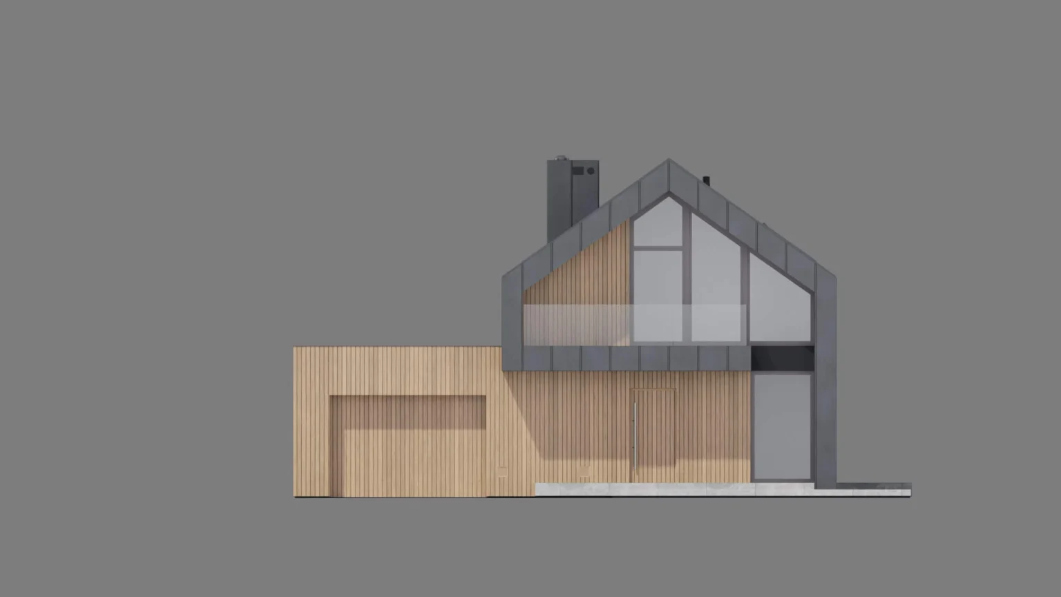 Taką samą okładziną drewnianą zostały obłożone drzwi wejściowe oraz brama garażowa, dzięki czemu tworzą one jednolitą, elegancką płaszczyznę. To rozwiązanie zapewnia efekt spójności i czystości formy, podkreślając nowoczesny charakter domu i nadając elewacji wyjątkowo dopracowany wygląd. Ukrycie tych elementów w strukturze fasady sprawia, że bryła domu zyskuje na lekkości i szlachetnej prostocie.