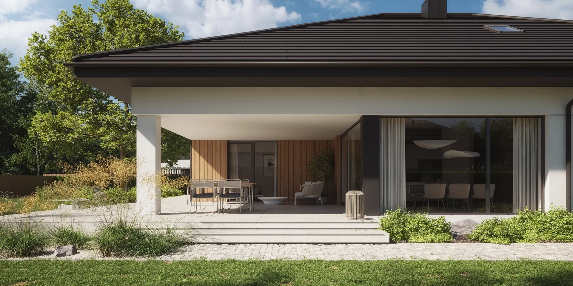 Z salonu prowadzi wyjście na zadaszony taras, który staje się naturalnym przedłużeniem strefy dziennej. Co ważne – taras jest dostępny również bezpośrednio z sypialni głównej.