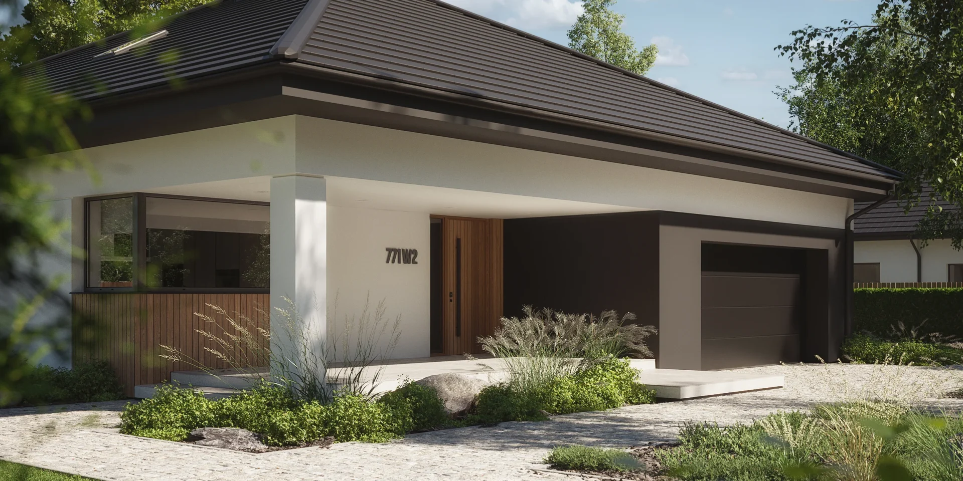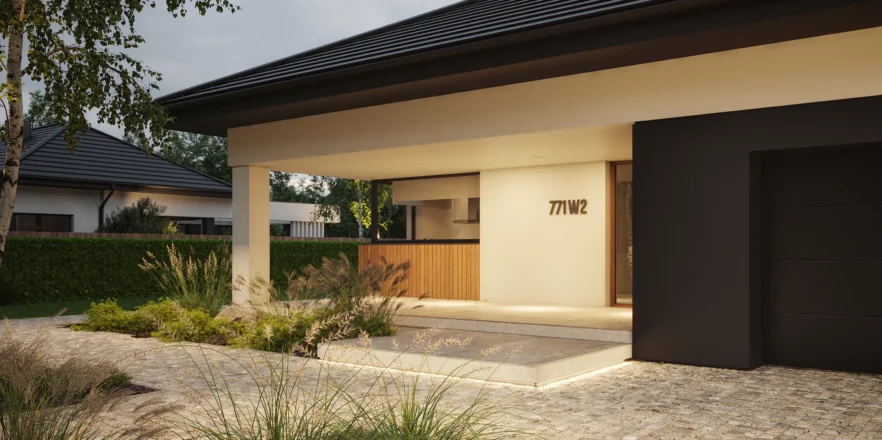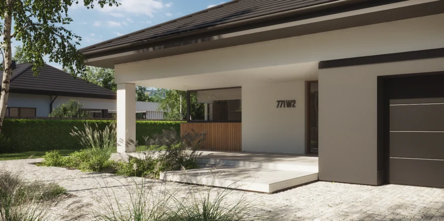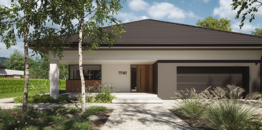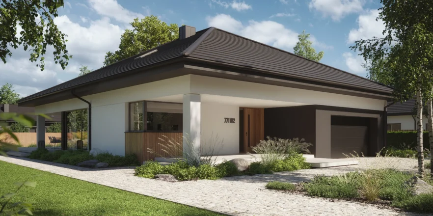 NewHouse 771 w2 to nowoczesna, komfortowa parterówka zaprojektowana dla rodzin, które szukają funkcjonalnej przestrzeni w rozsądnym metrażu. Ten projekt domu do 150 m² łączy przemyślany układ pomieszczeń, energooszczędne rozwiązania i ponadczasową estetykę.