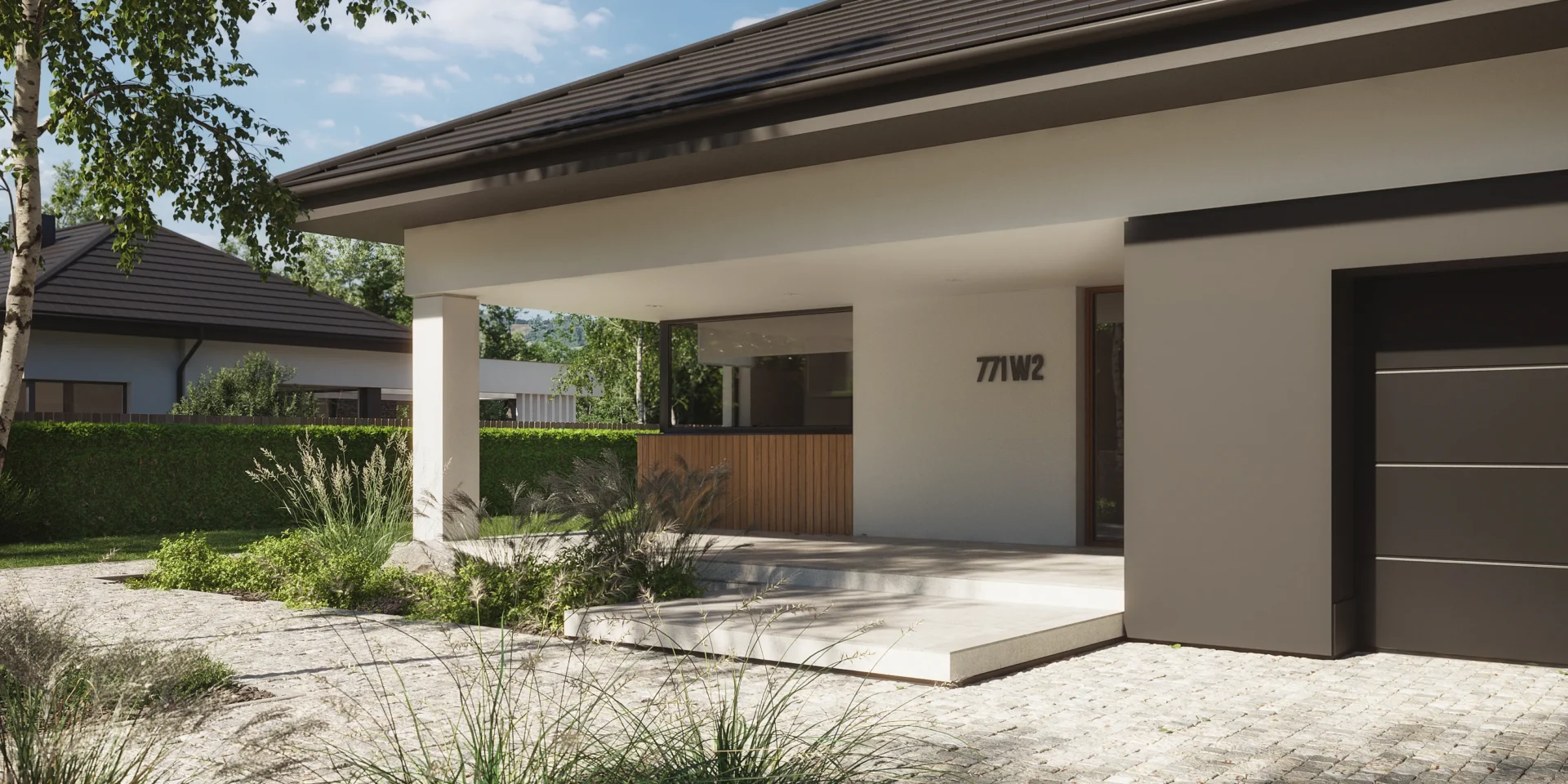 Strefa wejściowa do budynku jest zadaszona - to detal, który realnie wpływa na komfort codziennego życia. To nie tylko element estetyczny, ale przede wszystkim praktyczne rozwiązanie, które podnosi funkcjonalność domu. Zadaszenie chroni domowników podczas otwierania drzwi, szukania kluczy czy wnoszenia zakupów. Nie mokniesz, nie zasypuje Cię śnieg i nie ślizgasz się na oblodzonym progu. Ogranicza także bezpośrednie działanie opadów i promieni UV na drzwi wejściowe oraz fragment elewacji. Dzięki temu materiały wolniej się starzeją i dłużej zachowują estetyczny wygląd.