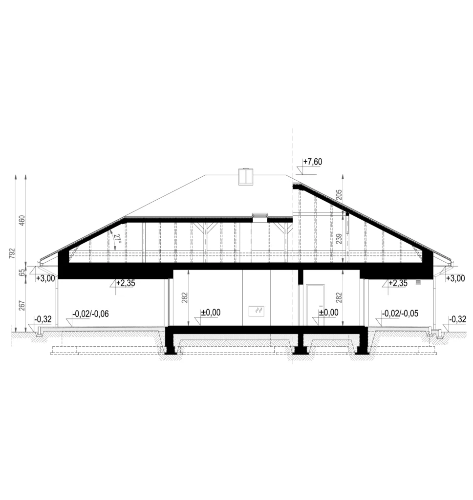 Bryła budynku mieści szeroki na 6,5 metra garaż dwustanowiskowy (39 m²) z bezpośrednim przejściem do domu. To rozwiązanie doceni każda rodzina – szczególnie zimą.