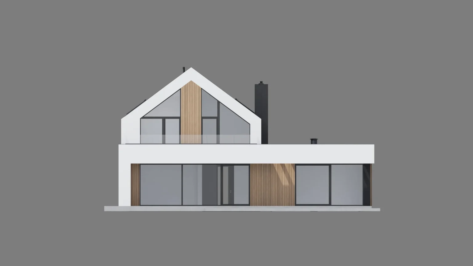Charakterystyczna, geometryczna bryła budynku z dwuspadowym dachem bez okapów idealnie wpisuje się w otoczenie wiejskie i podmiejskie. Elewację wzbogacono o duże przeszklenia, które dodają lekkości formie oraz wprowadzają do wnętrz mnóstwo naturalnego światła.